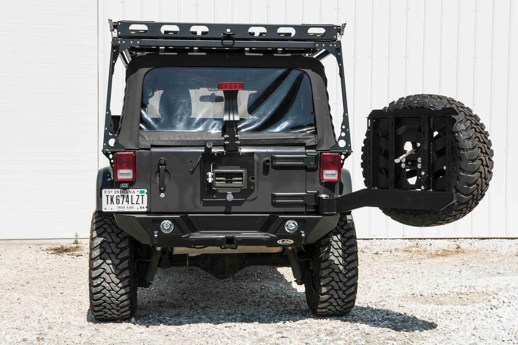 The LoD Offroad Jeep JK Destroyer Shorty Bumpers with Tire Carrier are engineered to a higher level. The stealthy look and versatile functionality makes a bold statement while protecting and enhancing your off road Jeep on the trail. The increased features allow you to customize your Jeep like never before! The rear bumper has been upgraded with light bezels which allow easy light change out by removing a few screws. The Destroyer Rear Bumpers fit universal flush mount, Rigid-D Pro series, Baja Squadron Series Lights, and LoD Offroad LED lighting by switching out the bezels. Orders with no lights will receive blank bezels to fill the light housing cavity. All Destroyer Tire Carriers come with high end industrial tapered roller bearings at the hinge point to decrease friction and wear. This allows effortless carrier operation like never before. The tire carrier can hold up to a 38" tire and still use the accessory options! The Destroyer Tire Carrier has way more options to fit all your needs on and off the trail. Fits your Nato Jerry cans or RotoPax gas you can easily adjust the gas cans up and down the tire carrier with a full 14" inches of adjustment. Trail rack has been upgraded with more adjustment to accommodate over-sized tire setups. The new Destroyer carrier design creates a door linked and non-door linked style setup in one. The linked carrier design is equipped with a one hand quick release push button to disconnect the carrier instantly. This makes it easier then ever to access or remove your carrier accessories. With more room on the carrier, we added more options. As a result, we created several tire carrier attachments from full adjustable gas cans to a universal multimounting system that allows you to attach axes, shovels, and more. The tow hitch receiver is built into the rear bumper and is tow rated the same as the factory(3500 lbs). Better look, higher quality, and more options!