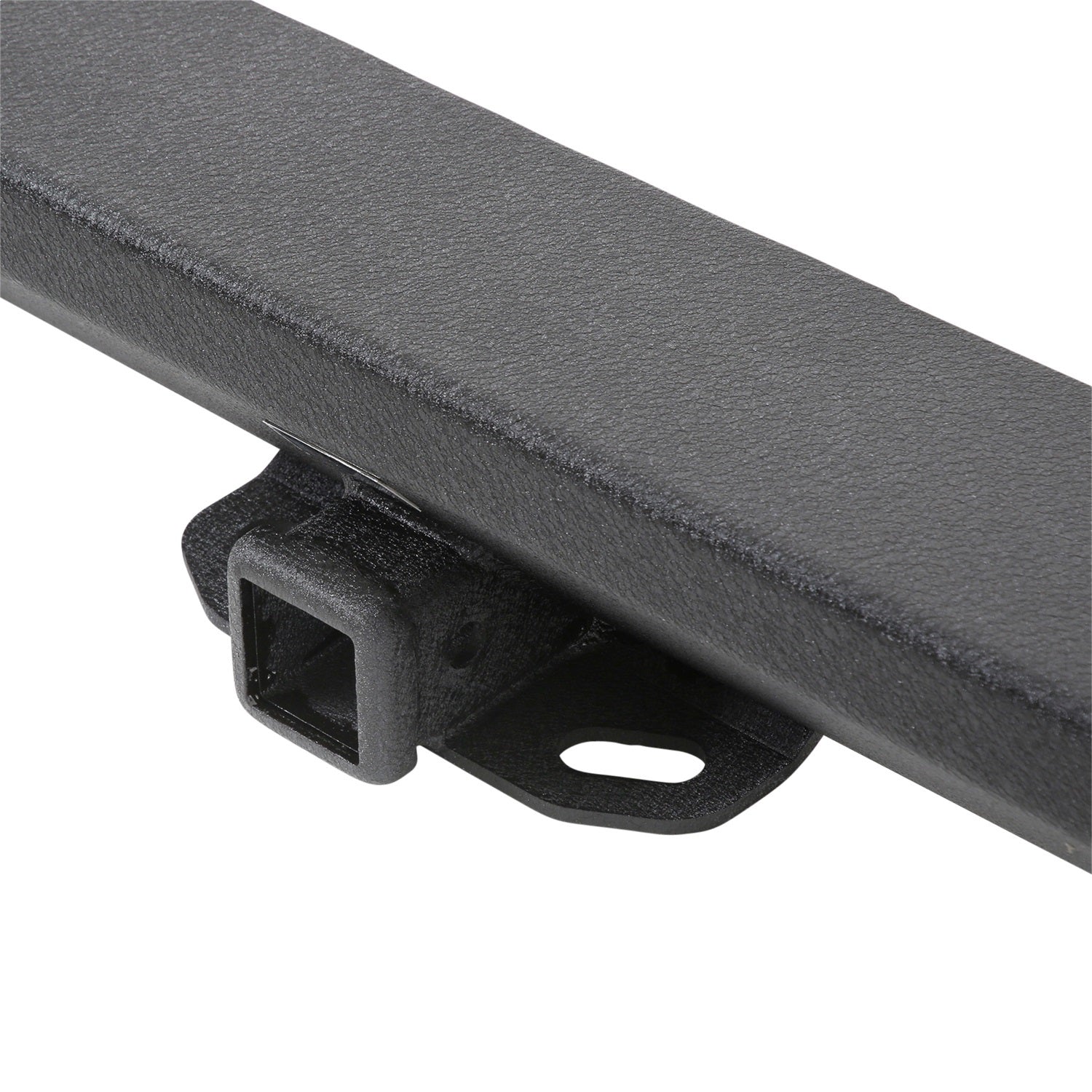 The rear bumper is manufactured out of 3/16 Inch cold rolled steel and comes standard with a built in class III receiver hitch and two solid d-ring mounts that are welded on the inside and out for maximum strength. Bumper is designed to accept the Smittybilt Swing Away Tire Carrier #76654.The swing away tire carrier can be added to the bumper at any time.