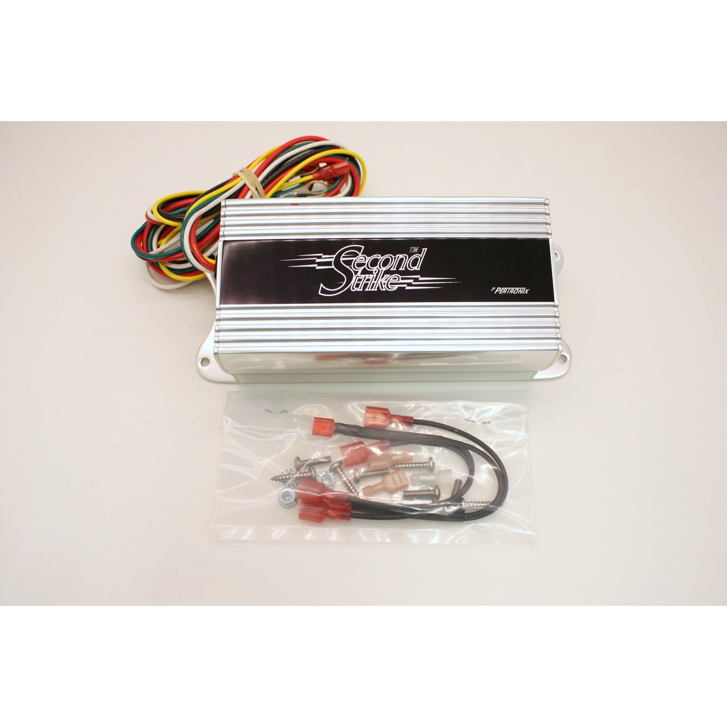 Second Strike is the only ignition system to provide a powerful second spark throughout the entire RPM range. Other multiple spark discharge systems typically revert to one spark at about 3000 RPM. The "Second Strike" is a microcontroller based ignition supplement that works with most inductive type systems. Following the primary spark, the Second Strike delivers a powerful capacative discharge second spark resulting in more complete combustion.