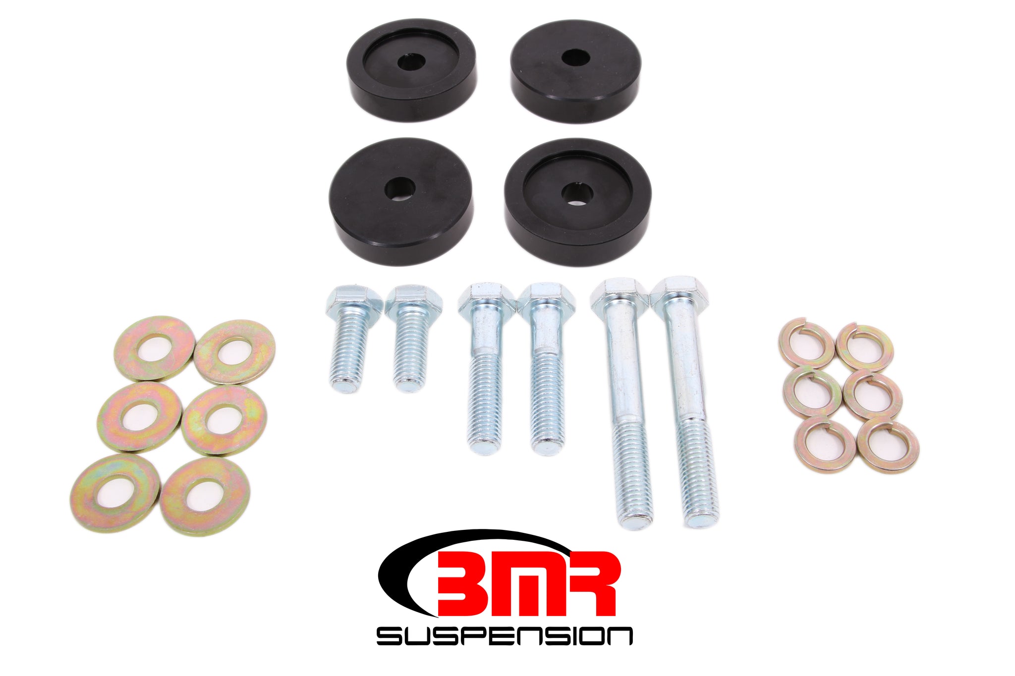 Minimize wheelhop and enhance the rear stability of your 2015 and newer S550 Mustang by decreasing differential bushing deflection with a Differential Bushing Lockout Kit from BMR Suspension. The stock rubber bushing with large voids are great for absorbing NVH, but do nothing for performance. The billet aluminum plates in BMR's Differential Bushing Lockout Kit simply keep the bushing from deflecting. BMR Suspension's Differential Bushings Lockout Kit drastically decreases differential movement and pinion rise over the factory rubber bushings. BMR designed its Differential Bushing Lockout Kit from 6061-T6 billet aluminum. This material is extremely strong, without significant weight gains. Each bushing lockout plate is CNC-machined to exact tolerances. This allows for a perfect fit and increased performance for any driving style. Designed for street performance, drag race, and handling applications. BMR Suspension's BK054 Differential Bushing Lockout Kit is the perfect wheelhop solution for any S550 Mustang being used for performance driving. The kit offers huge increases in performance over the stock rubber bushings. The OE bushings are designed with air pockets and are made from soft rubber. These ?voids?, coupled with soft material produce excessive differential movement during normal and aggressive driving. BMR's Differential Bushing Lockout kit installs over the OE rubber bushing, nearly eliminating differential movement by filling the space between the bolt and bushing cup. This eliminates almost all differential movement, reducing wheelhop and increasing traction, while giving you a much-improved overall feel in any performance driving situation. BMR Suspension's BK054 Differential Bushing lockout Kit is available in a durable black finish and comes with all necessary hardware. Installation time is about 1 hour. Proudly made in the U.S.A.!