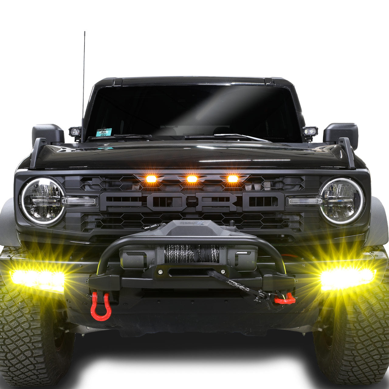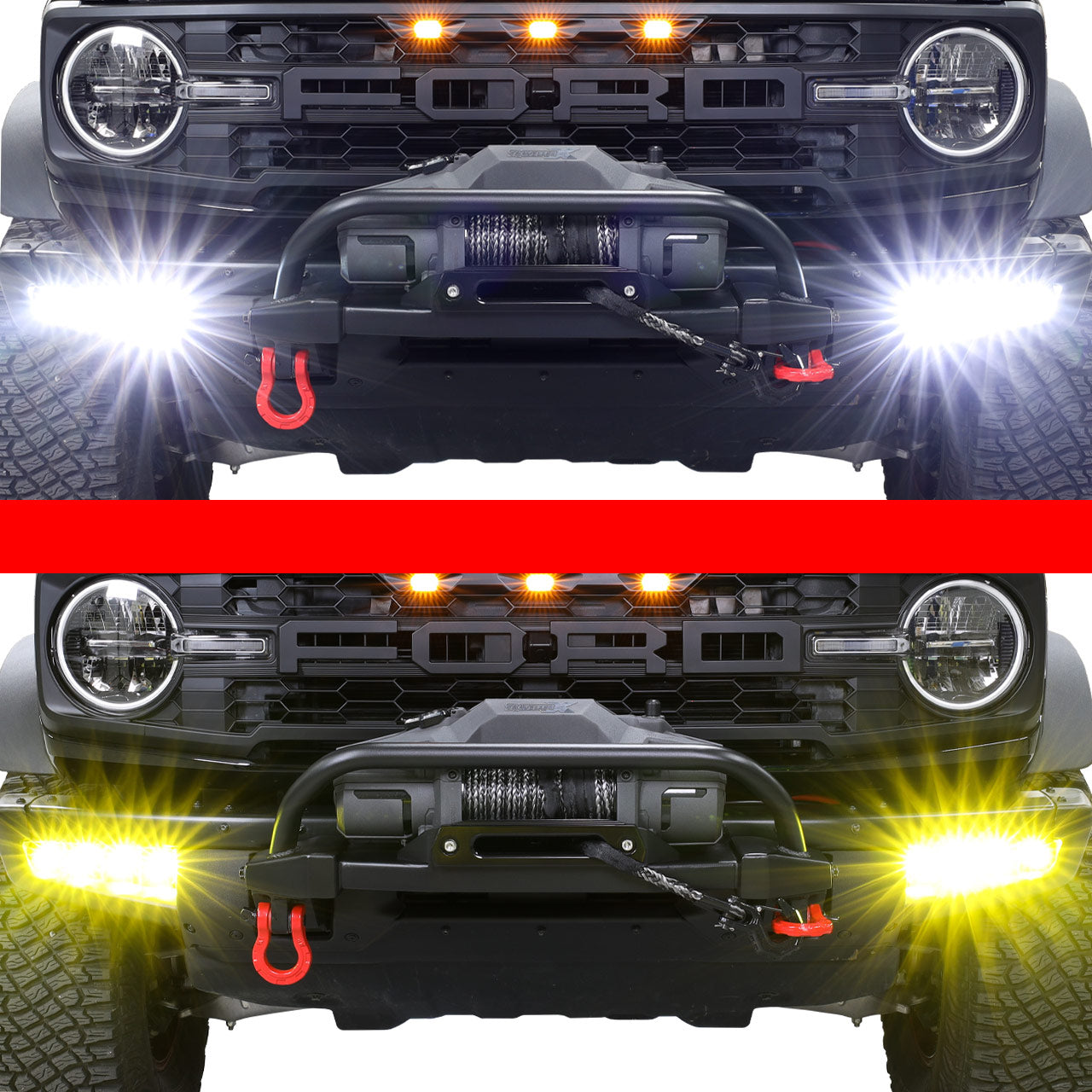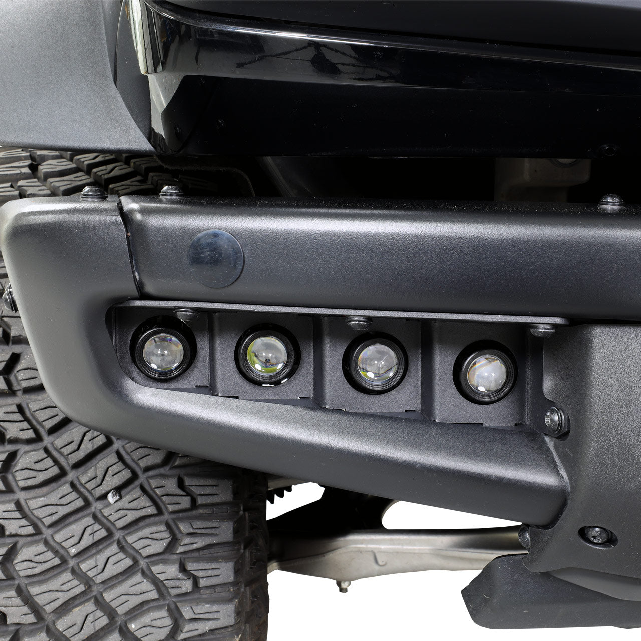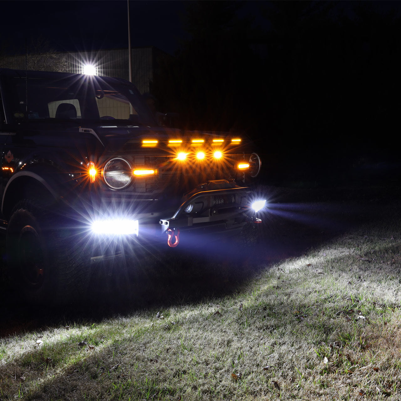 The IAG I-Line 4 Lamp Fog Light Kit is designed to be used with your Bronco’s optional modular bumper. This heavy-duty lighting kit adds additional front lighting for driving at night or in bad weather, and is durable enough to handle off-road conditions. The IAG I-Line 4 Lamp Fog Light Kit is easy to install with the provided wiring harness to your factory auxiliary switches or aftermarket switch panel. IP67 rated, these lights are designed to be waterproof. The I-Line Fog Light Kit is designed to work with your auxiliary switch panel and features individual wiring for each light color to allow toggling between the white and amber LED lights depending on driving conditions. When both colors are toggled on the amber light overrides the white lights. Alternative methods of installation are possible with modifications. This fog light kit is designed to work with your Bronco’s optional factory switch panel. If your Bronco is equipped with AUX switches there is no need to install another switch.