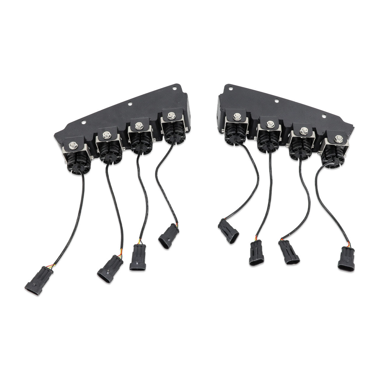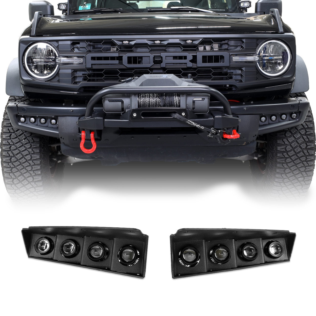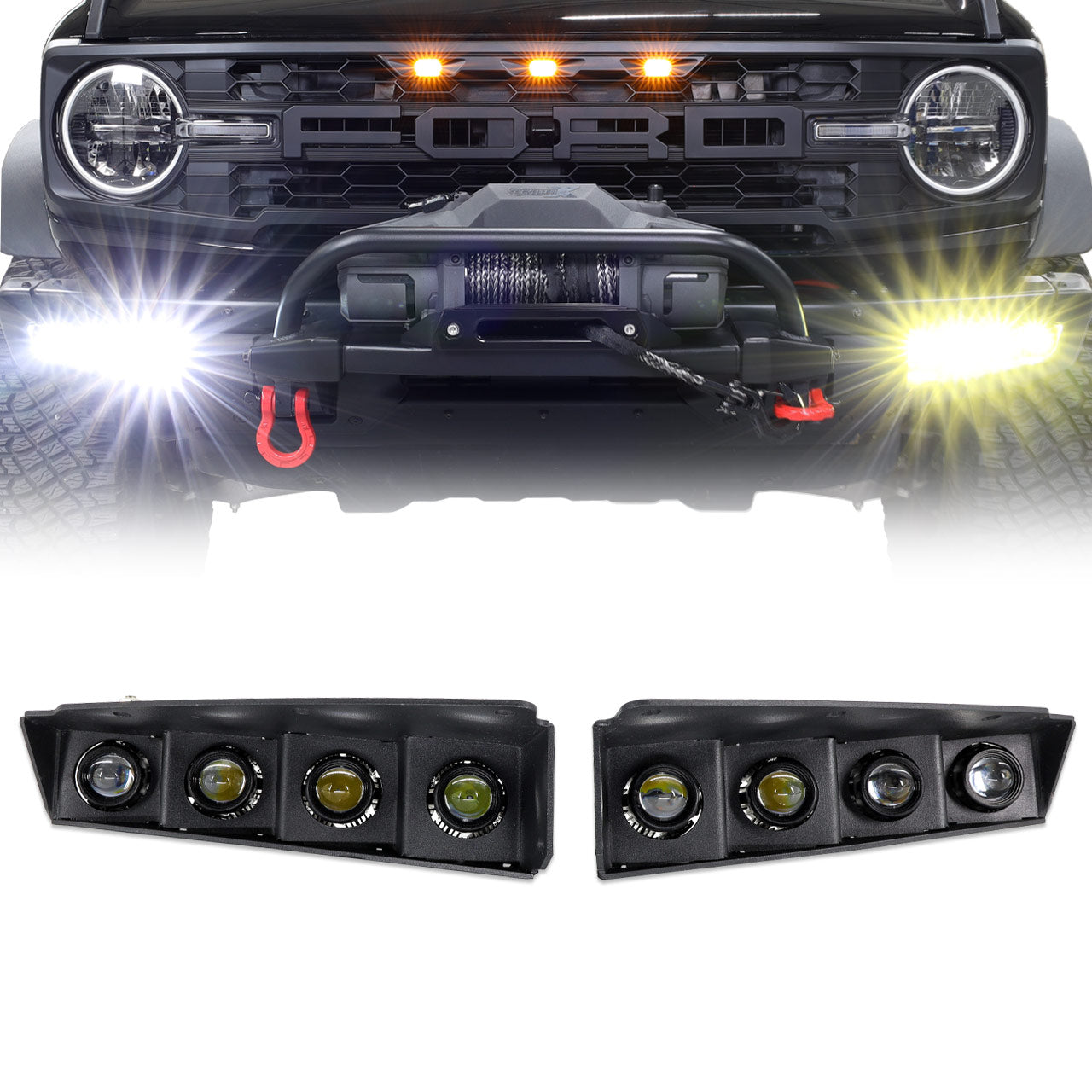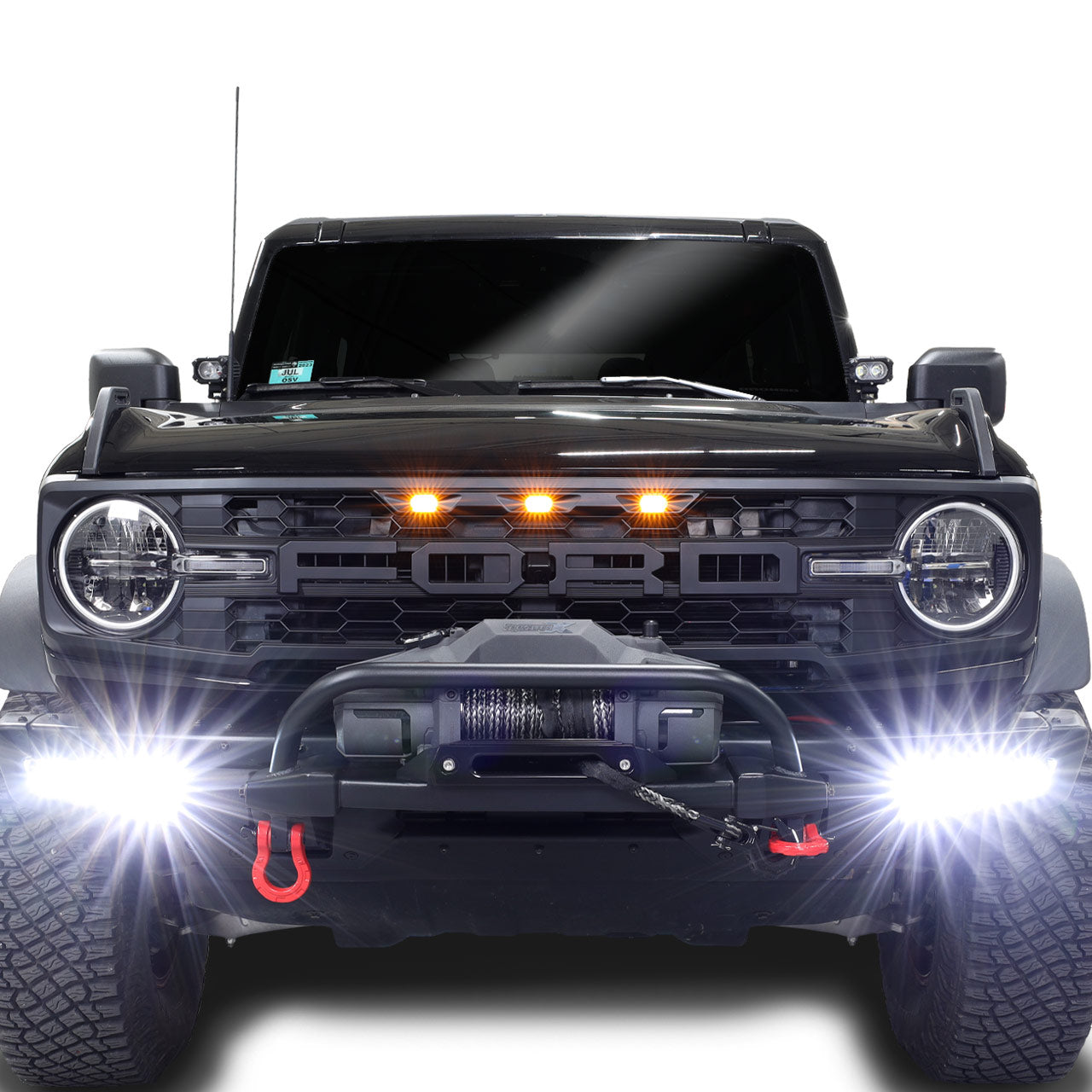 The IAG I-Line 4 Lamp Fog Light Kit is designed to be used with your Bronco’s optional modular bumper. This heavy-duty lighting kit adds additional front lighting for driving at night or in bad weather, and is durable enough to handle off-road conditions. The IAG I-Line 4 Lamp Fog Light Kit is easy to install with the provided wiring harness to your factory auxiliary switches or aftermarket switch panel. IP67 rated, these lights are designed to be waterproof. The I-Line Fog Light Kit is designed to work with your auxiliary switch panel and features individual wiring for each light color to allow toggling between the white and amber LED lights depending on driving conditions. When both colors are toggled on the amber light overrides the white lights. Alternative methods of installation are possible with modifications. This fog light kit is designed to work with your Bronco’s optional factory switch panel. If your Bronco is equipped with AUX switches there is no need to install another switch.