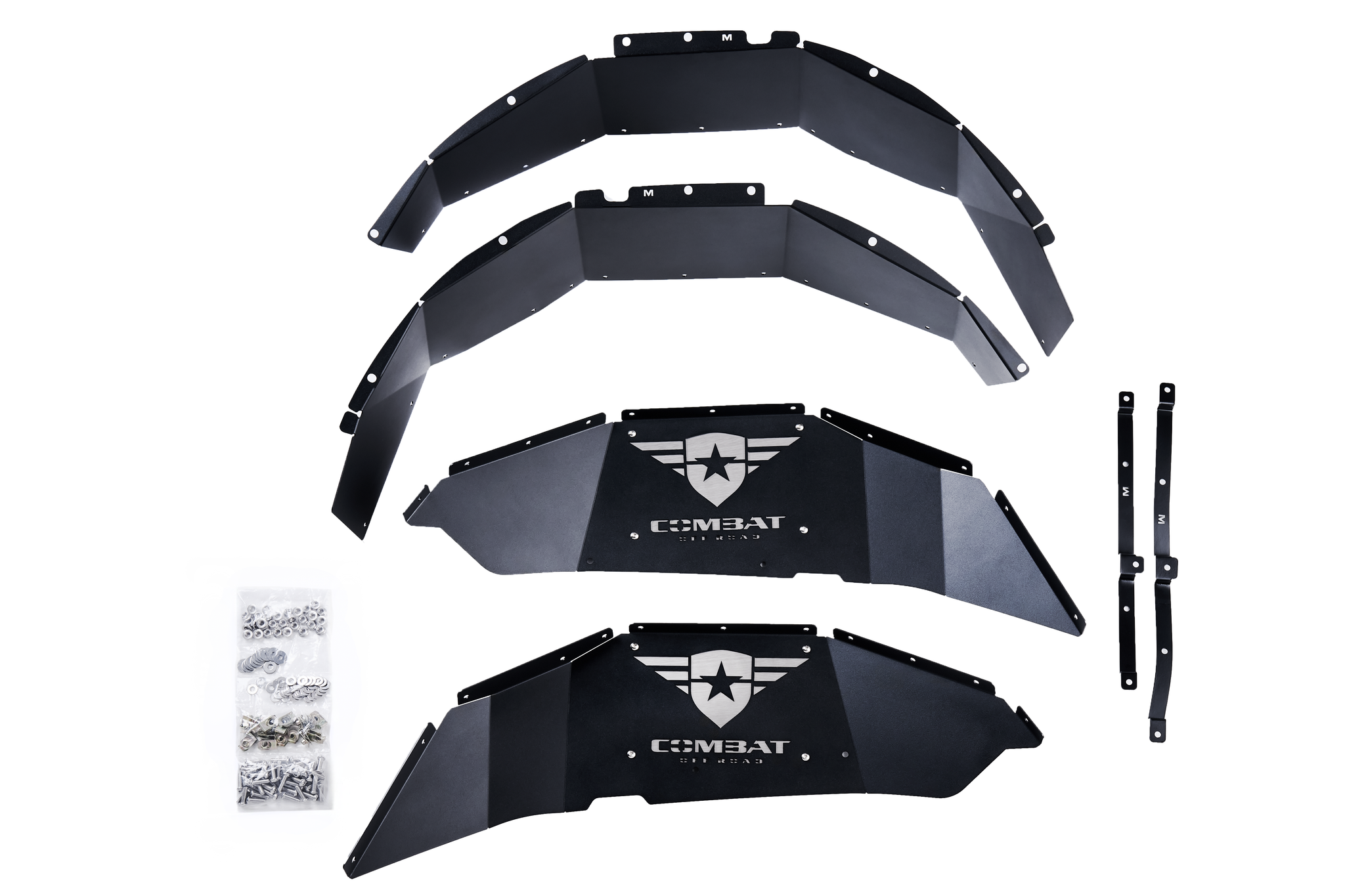 Fitting the 2018+ Jeep Wrangler JL/JLU, our Battle Ready Inner Fenders will protect your engine bay from rocks and debris while releasing the heat that builds up during those slow-moving trail rides in the hot summer.  The high UV load black powder-coated aluminum construction will hold up under even the toughest conditions while maintaining proper airflow through the mesh inserts. Made from laser-cut, 6063 aluminum with stainless steel hardware, the Battle Ready Inner Fenders are easy to install and include a removable, customizable backing plate. This product is covered by the Combat Lifetime Guarantee.