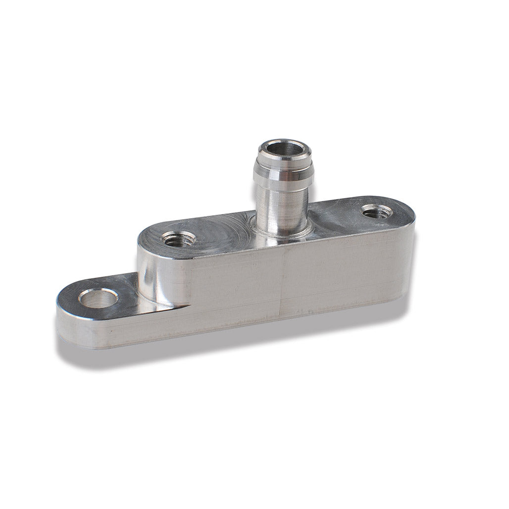 The IAG Performance Fuel Pressure Regulator (FPR) adapter is designed to allow the stock FPR to be remote mounted. This is common when performing upgrades such as larger injectors, fuel rails and fuel lines and is a standard feature when purchasing the IAG billet fuel rails. This adapter retains the stock fuel line outlet and converts the o-ring inlet to a 3/8 inch OD hose barb. It also features a 1/4 inch hole to allow universal mounting in the engine bay with a single 6mm bolt. The FPR adapter is engineered and manufactured in our own facility in Westminster, Maryland. It is machined from a single piece of 6061 aluminum and includes the zinc coated steel hardware.