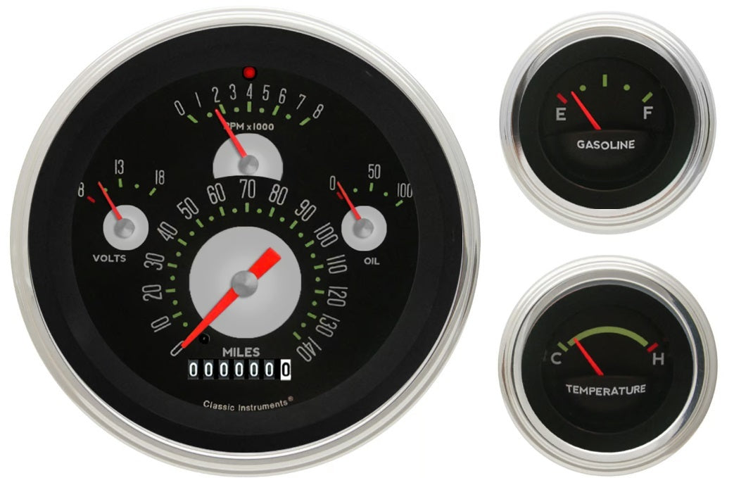 Gauge Kit - 1957 Chevy Package - Analog - Fuel Level / Oil Pressure / Speedometer / Tachometer / Voltmeter / Water Temperature - Black Face - Kit