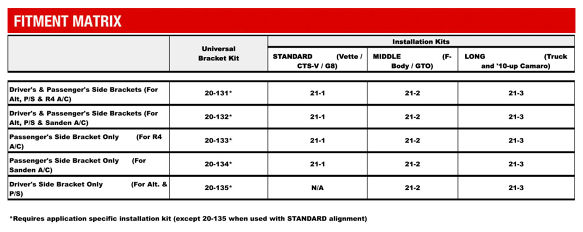A Fitment And Required Components Guide helps you locate and source components and provides other notes and helpful hints. Three easy steps will get you going. Step one is to determine your belt alignment based on your crank pulley position on the engine you have. Step two is to choose the Holley accessory drive brackets that you need (A/C, Alt & P/S or both). Step three is to see which Holley installation kit your set-up requires to line up your accessories with your crank pulley position. An application specific installation kit (part # 21-1, 21-2, or 21-3) is REQUIRED for most applications.
