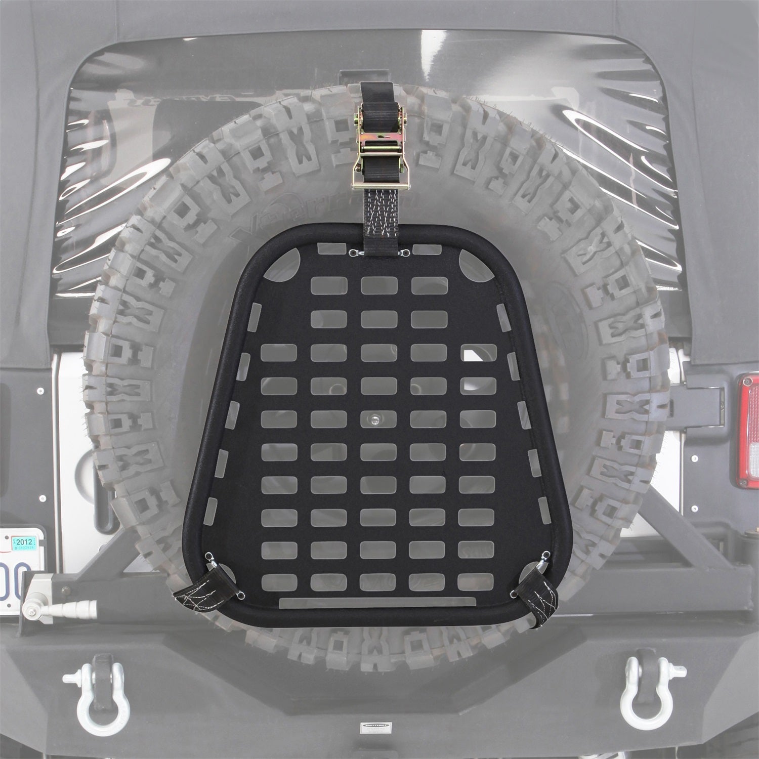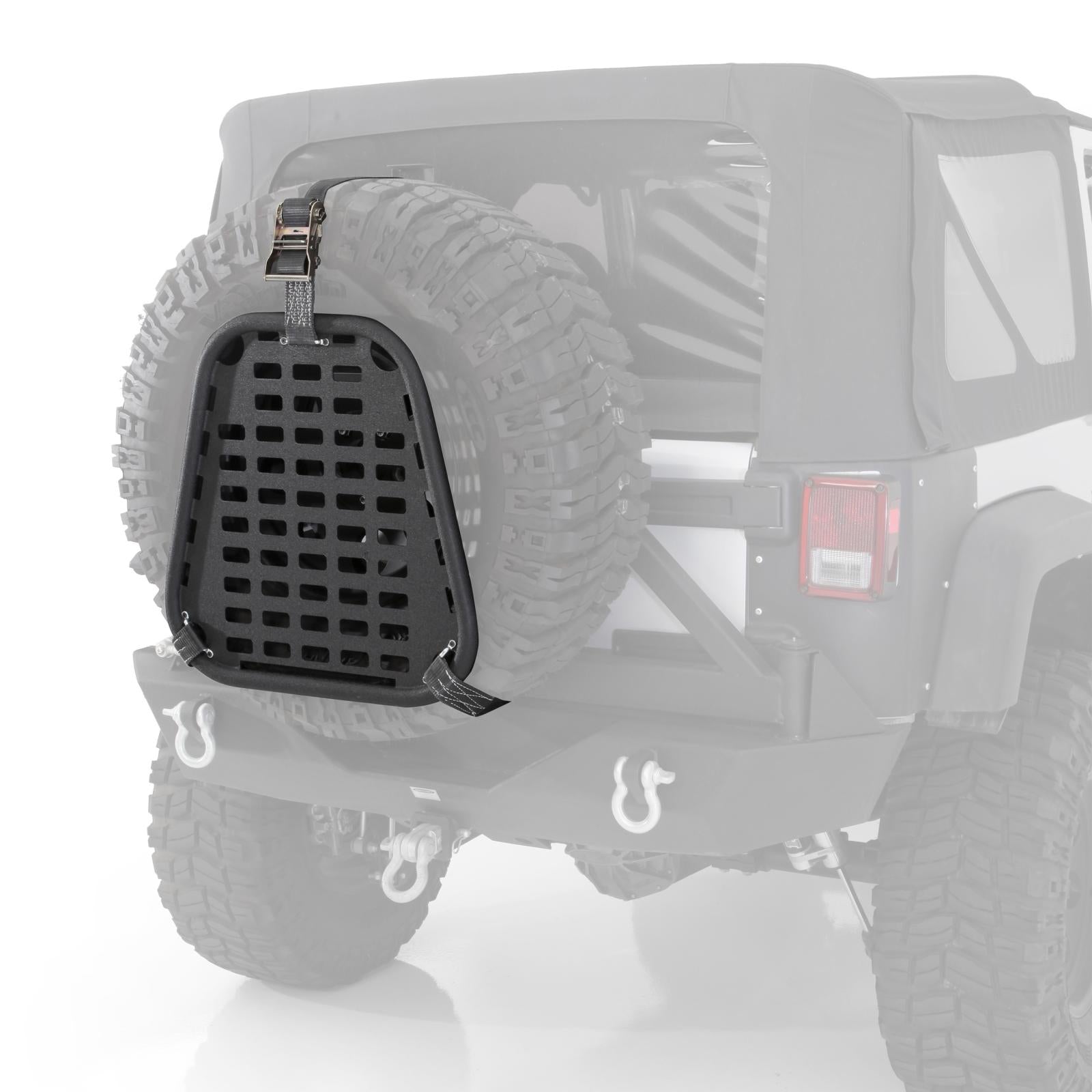 The iRack II custom mounts to any spare tire up to 40 inches using heavy duty straps and has storage capacity for gear ranging from Jerry cans to Molle Pals Pouches to Trail or High-Lift Jacks.