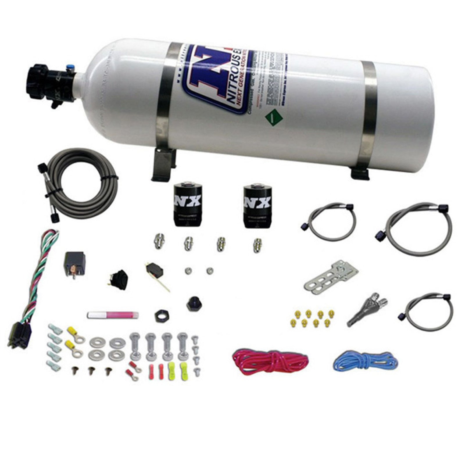 Description_MKT If you want the best, this is it. The NX Stage 1 EFI nitrous system is the top of the line EFI power booster on the market. From the highest flowing solenoids, to our patented Shark nozzle, this system screams nothing but quality. NX has a system for every EFI car in the world. Available in horsepower levels from 35-50-75 for most 4 and 6 cylinder cars, and up to 150 for 8,10, and 12 cylinder engines. This NX EFI Stage One system comes complete with a 15lb bottle, stainless bottle bracket, Lightning solenoids, extra long stainless braided N2O line, and all necessary hardware to complete the installation.