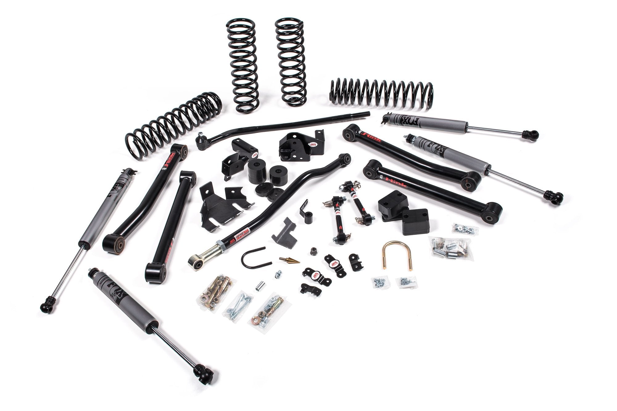 Easy to install bolt on performance suspension to handle the toughest off road trails and drive you home after. These J-Konnect Systems build off the base J-Venture to add J-Link lower control arms and other bracing for equal parts on-road handling and off-road capability and strength. These lower control arms not only add front caster and rear wheelbase, they are a serious upgrade to the strength over the factory control arms. Built 2” x .250-wall DOM tubing while offering better NVH isolation with large factory style rubber bushings at both ends. The integrate a drag bar flip kit to flatten out the steering angle for improved handling as well as provide front and rear track bar braces. These combined with the dual rate coil springs, adjustable track bar, quicker disconnects and more offer improved trail performance and strength while catering to on-road handling needs. Rounding out these kits are a set of FOX 2.0 Performance Series IFP shocks with remote reservoir for even better offroad performance, fluid capacity and feature an aluminum body for faster heat dispersion.