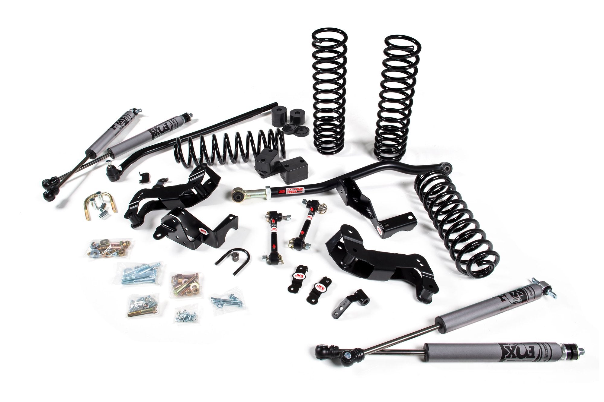Increase the clearance and performance of your 2-Door Jeep Wrangler JK with a 3.5" lift kit J-Kontrol™ suspension system for exceptional handling and stability both on and off road. A step up from JKS J-Venture™ systems, J-Kontrol™ is a true bolt-on kit that adds front control arm correction brackets and a drag link flip kit to a J-Venture kit's list of components -- including JSPEC dual-rate coil springs, custom-valved FOX Adventure Series shocks, an adjustable track bar, Quicker-Disconnect sway bar links, and more. JKS supplies control arm brackets to further enhance on-road handling. The brackets flatten out your Jeep's control arm angles to more closely mimic factory geometry while correcting caster. The Drag Link Flip Kit flattens the steering angle to mimic factory geometry. J-Kontrol offers enhanced performance for daily driving, beach cruising, or regular trail use. Take control with J-Kontrol.