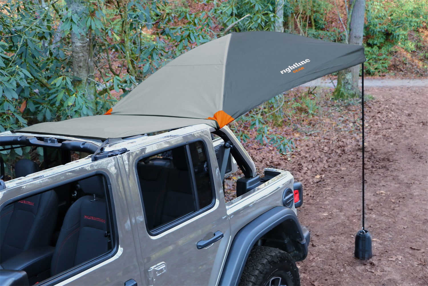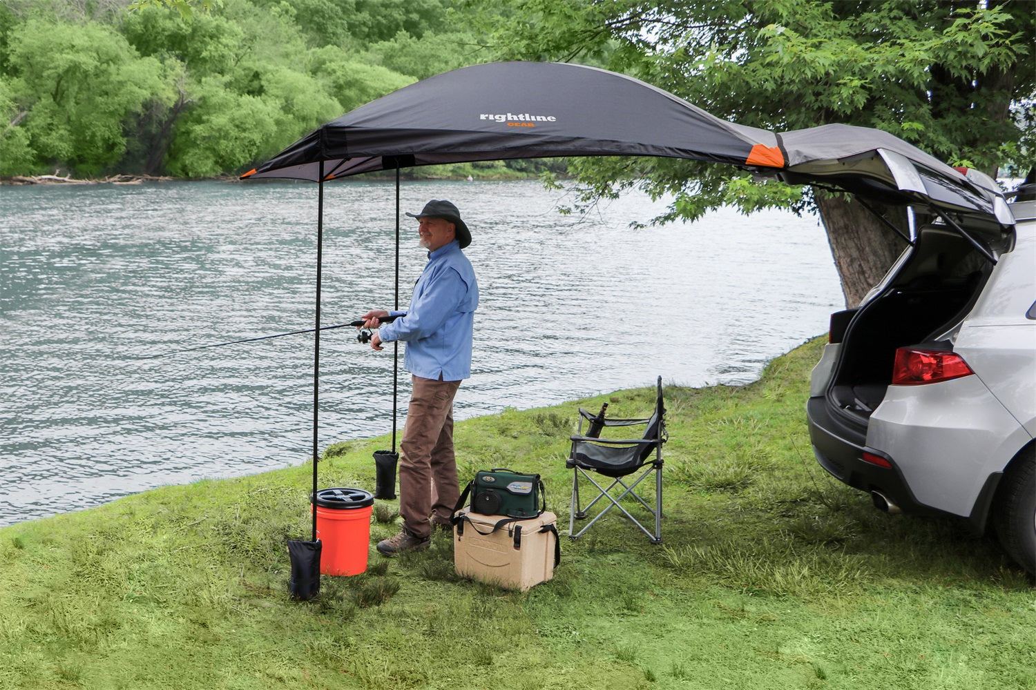 Description_MKT The Rightline Gear SUV Tailgating Canopy provides easy shade at the game or the campground. The Canopy attaches to your rear hatch door and extends out from the vehicle. The sandbags attach to the Canopy's poles to keep them firmly planted to the ground, even in a strong wind. Traditional E-Z Up Tents are too large for stadium parking spaces, require a long set up time, and blow around in the wind. Take your tailgating experience to the next level with the SUV Tailgating Canopy!