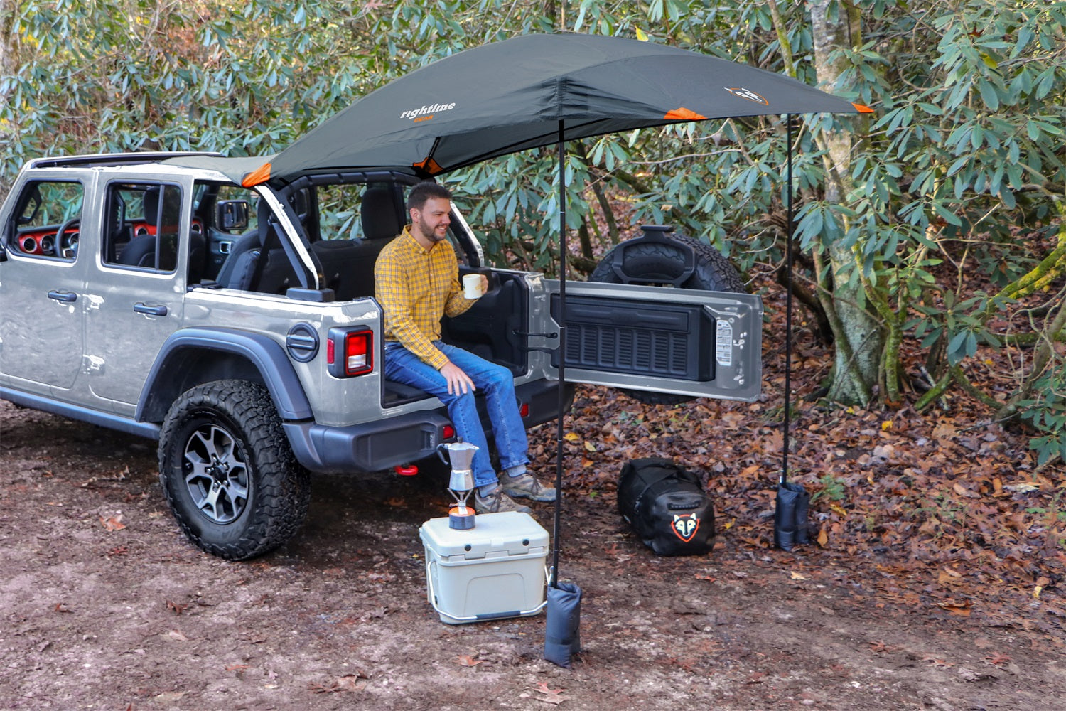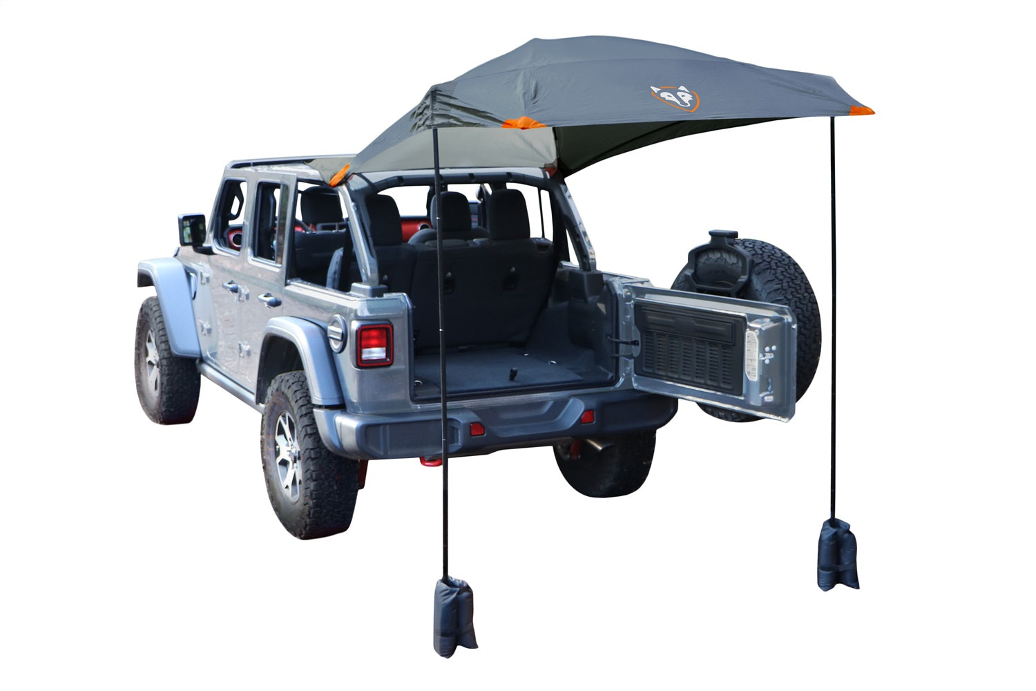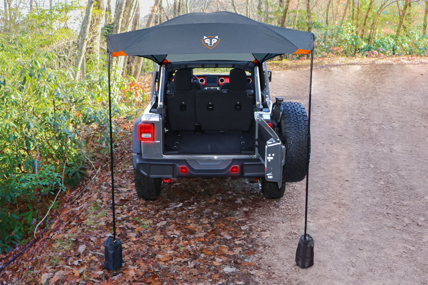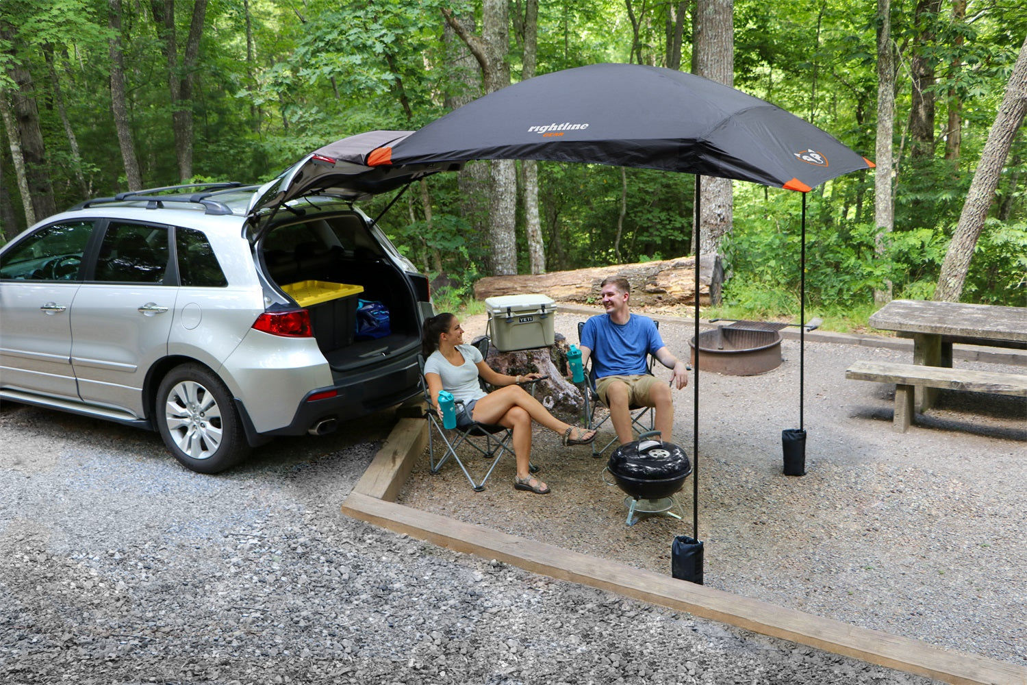 Description_MKT The Rightline Gear SUV Tailgating Canopy provides easy shade at the game or the campground. The Canopy attaches to your rear hatch door and extends out from the vehicle. The sandbags attach to the Canopy's poles to keep them firmly planted to the ground, even in a strong wind. Traditional E-Z Up Tents are too large for stadium parking spaces, require a long set up time, and blow around in the wind. Take your tailgating experience to the next level with the SUV Tailgating Canopy!