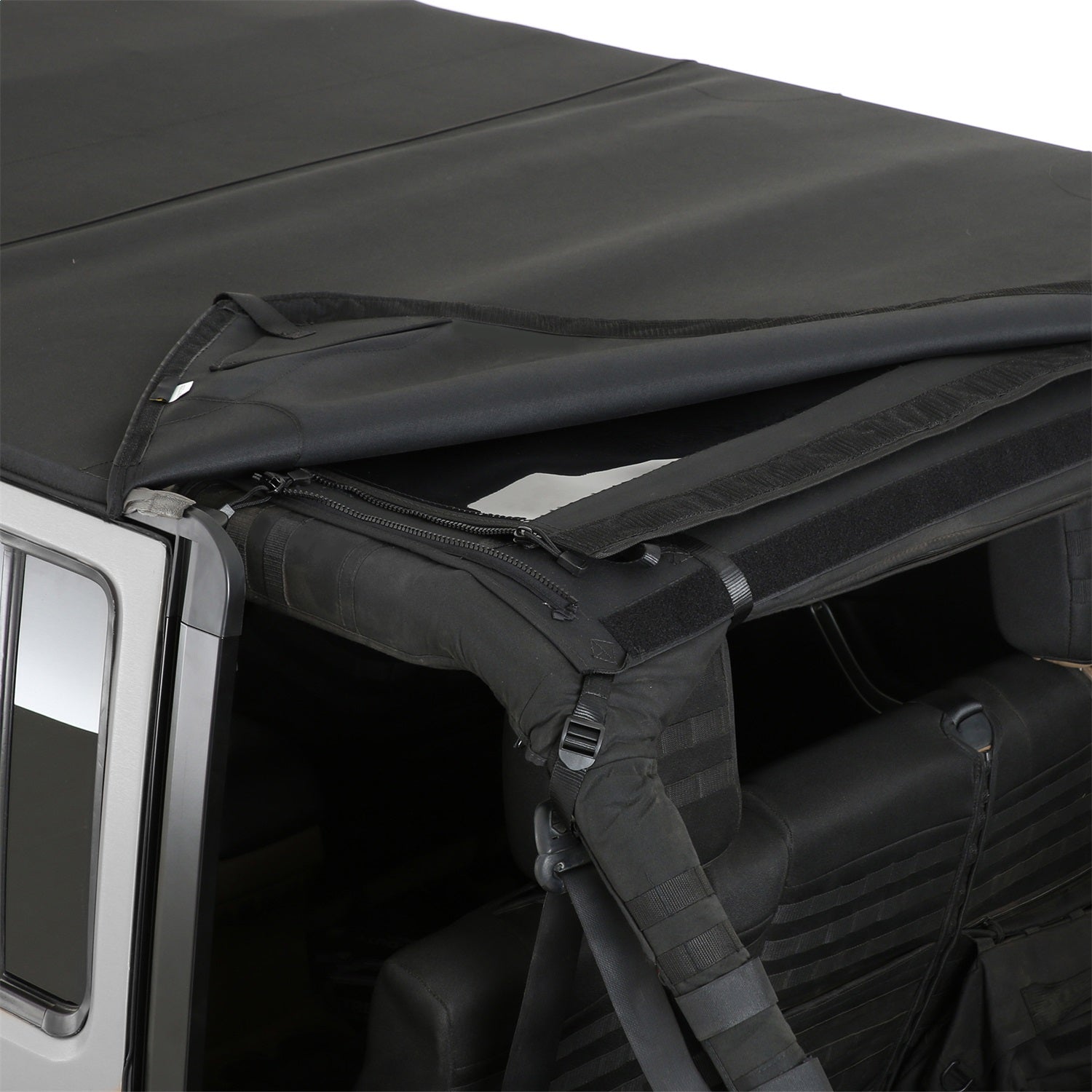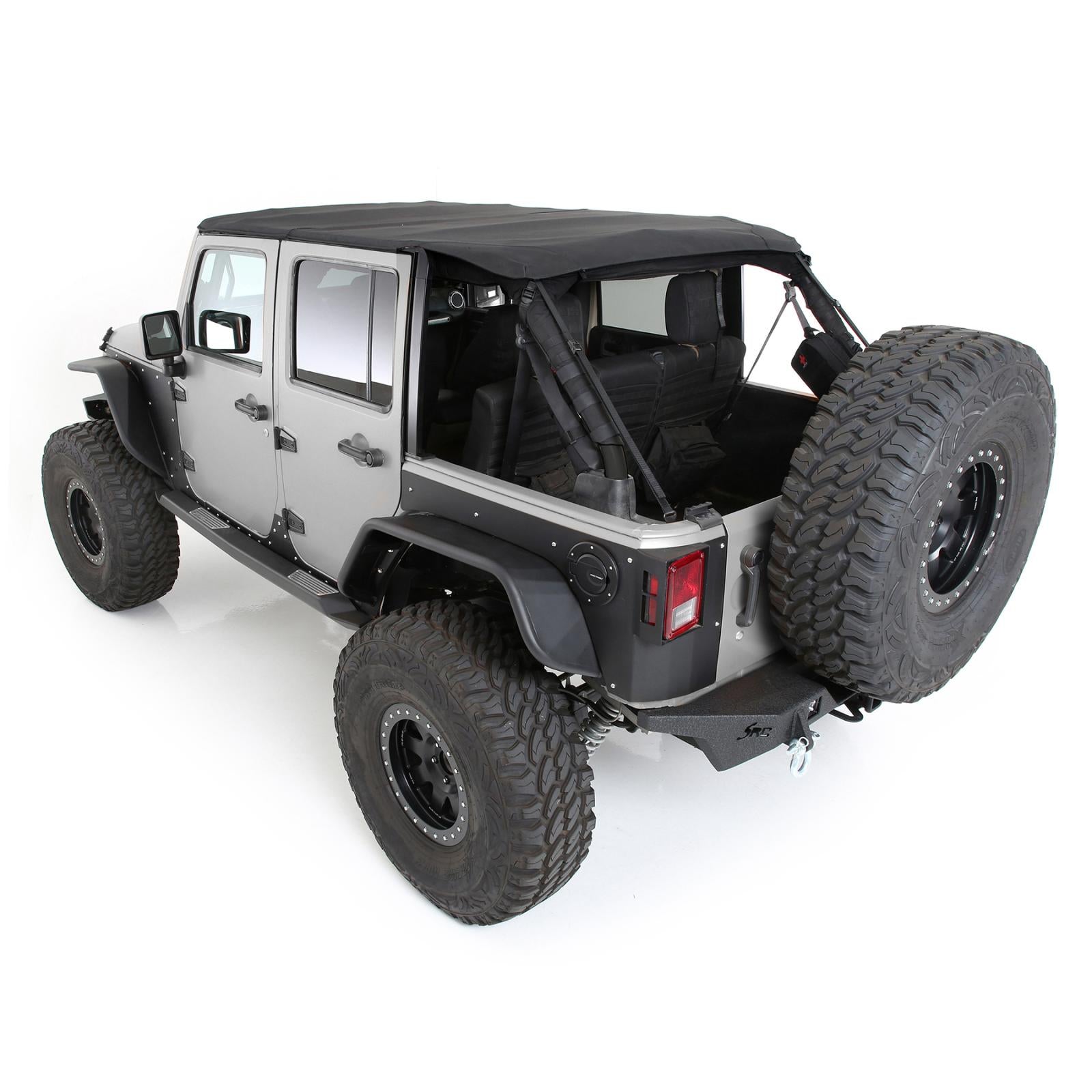 The Bowless/Combo Top from Smittybilt is the most adaptable Jeep top. When hitting the trail hard on a sunny day and clouds roll in you can quickly convert your Smittybilt Bowless/Combo Top from an extended top to a weather protected full top. Convenience is factored in due to internal storage of the removable side curtains. This top requires the use of the factory door surrounds and tailgate bar, as well as a header windshield channel (sold separately.)