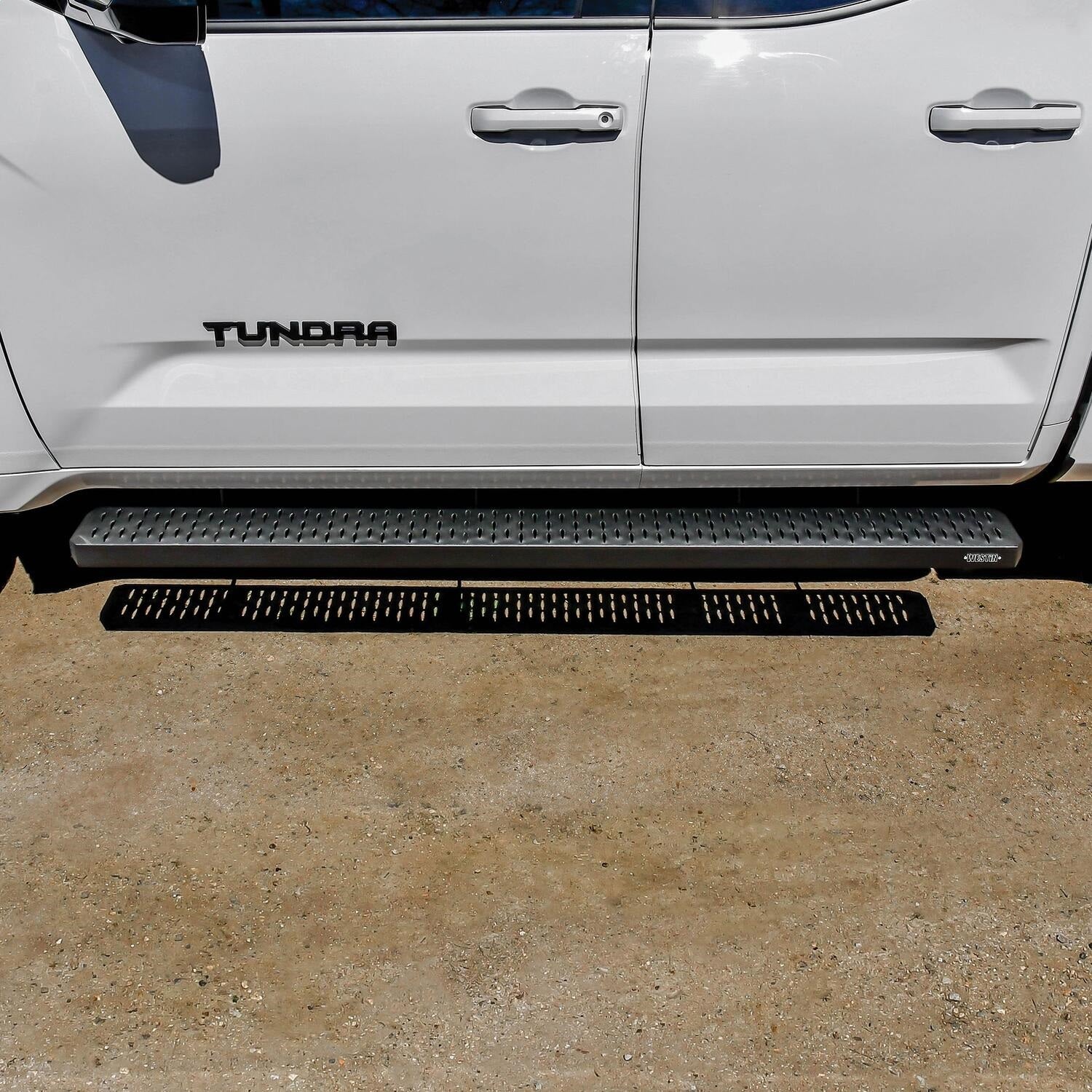 Westins Grate Steps Running Boards are engineered to provide maximum traction without sacrificing style. The 6 1/4 in. step surface width features an aggressive 1/4 in. high punched tread allowing traction in any weather condition. The unique serrated edges help clean dirt, snow and mud off your boots to keep truck cab clean. Grate Steps Running Boards feature stylishly formed and fully welded ends with a custom die-cast riveted logo badge. E-coated base coat provides long lasting corrosion protection which far surpasses that of the competition. Solid 1-piece construction makes the Grate Steps Running Boards ideal for construction, commercial, vans and utility use. Available in universal lengths (54 in., 68 in., 75 in., 79 in., 83 in., 86 in. and 90 in.) with vehicle specific mount kit required, sold separately. Available in textured black finish.