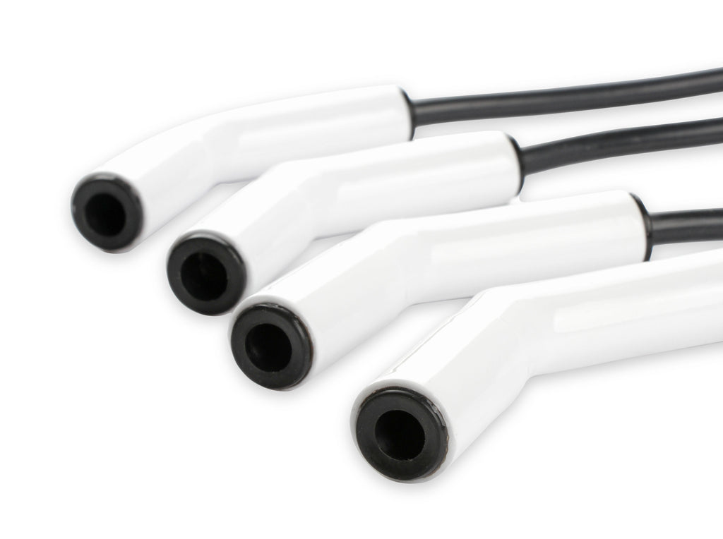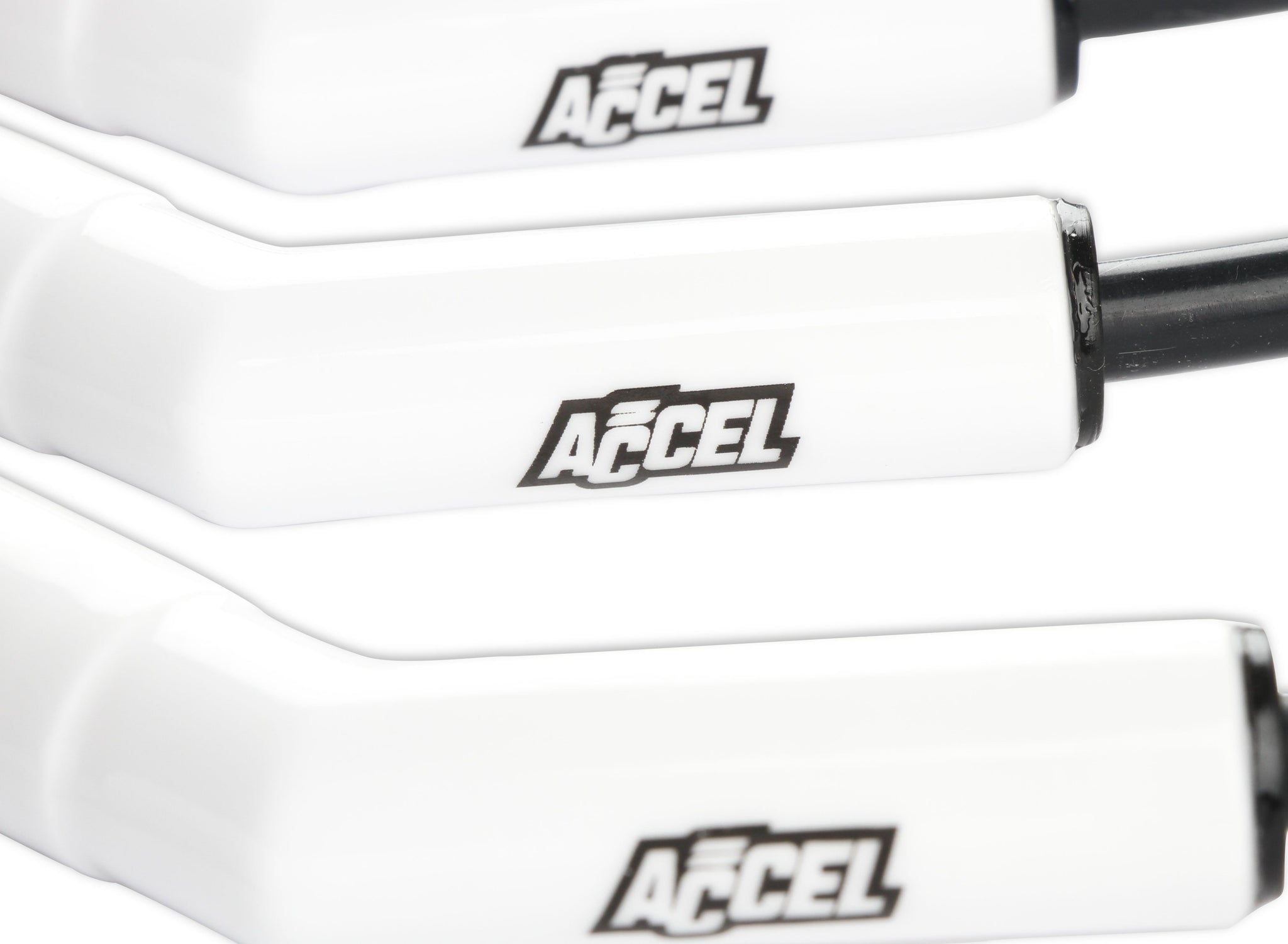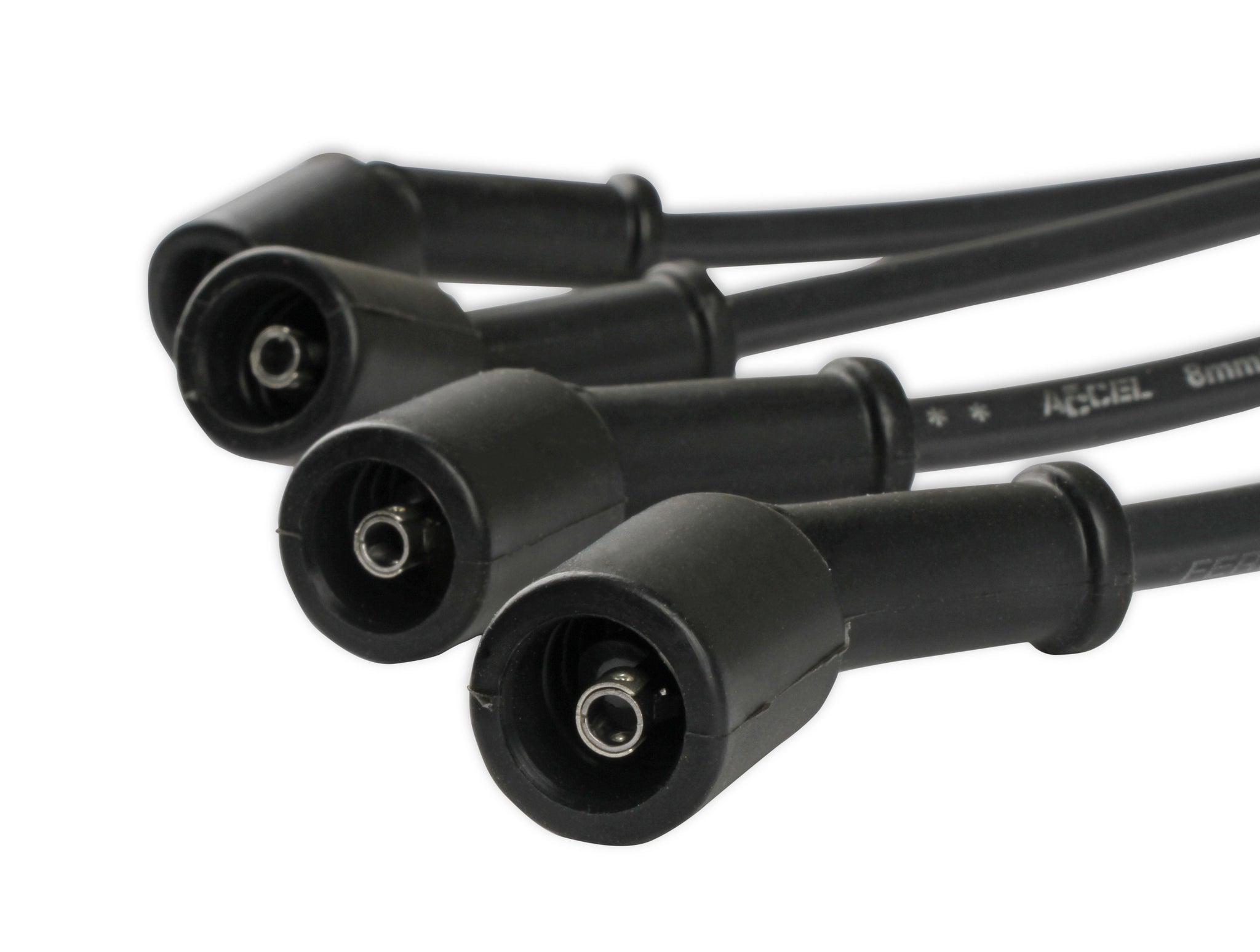ACCEL now offers the cure for burnt spark plug boots with Extreme 9000 Ceramic wire kits. The 8mm Ferro-Spiral core wire now has ceramic boots on the spark plug end of the wires. Ceramic boots withstand up to 2,000 degrees. Great for running headers with close tolerances, an engine bay with little room, or an RV with boots that melt because of heat. Ultra high temperature double silicone construction wire rated at 600 degrees fahrenheit peak. 500 ohms/ft Ferro-Spiral core developed for performance use. Excellent energy delivery to the spark plugs, while providing the highest level of RFI/EMI suppression. Stainless steel spark plug terminals for maximum spark energy to the plugs. Pre-made to factory lengths for a perfect fit.