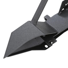 The XRC Bumpers have high degree approach angles and raised corners to maximize ground clearance. Manufactured from 3/16 cold rolled steel and then robotically welded to the exact specifications. Solid mount D-rings that are welded on the inside and outside. Welds are ground down and smoothed out, then a two stage textured matte black powder coat is applied for the ultimate look. The front stinger is 1.75 tubing and has two light tabs that can hold up to two 9 lights. It Inchs unique design is capable of mounting up to a 10,000 lb. winch with the option of running an aluminum or roller fairlead. Rear Bumper features a 2 receiver hitch and two D-ring mounts.